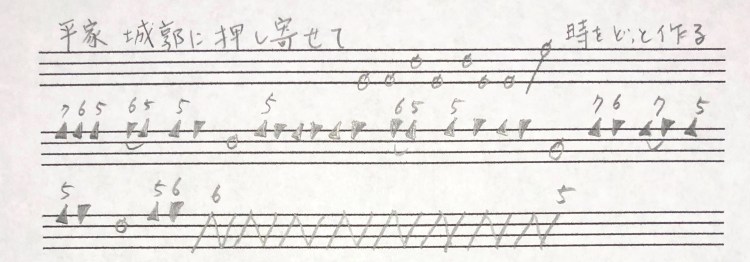 There is no piercing beat through a biwa piece, unlike western music (see a sample music in the picture — there are no bars). One note could be longer or shorter. Although there are set patterns and students try to imitate and internalize their teachers’ ways of playing, it is ultimately the player’s sense that decides the song’s tempo.