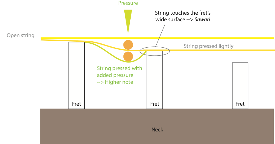 Further, those frets and the nut are wide, which provides a surface, not a point, for a string to touch. This causes sustained, buzzing noise (sawari) which add very unique flavor to the biwa sound. The surface of the frets is constantly shaved by strings, and one of the most important points in the maintenance of the biwa is to keep the surfaces as flat as possible to get good sawari. The diagram below shows the mechanism of oshikan and sawari.